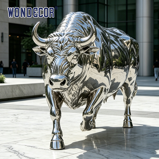 This mirror-polished stainless steel charging bull sculpture is expertly crafted for decorative applications in gardens, parks, squares, and various commercial settings.